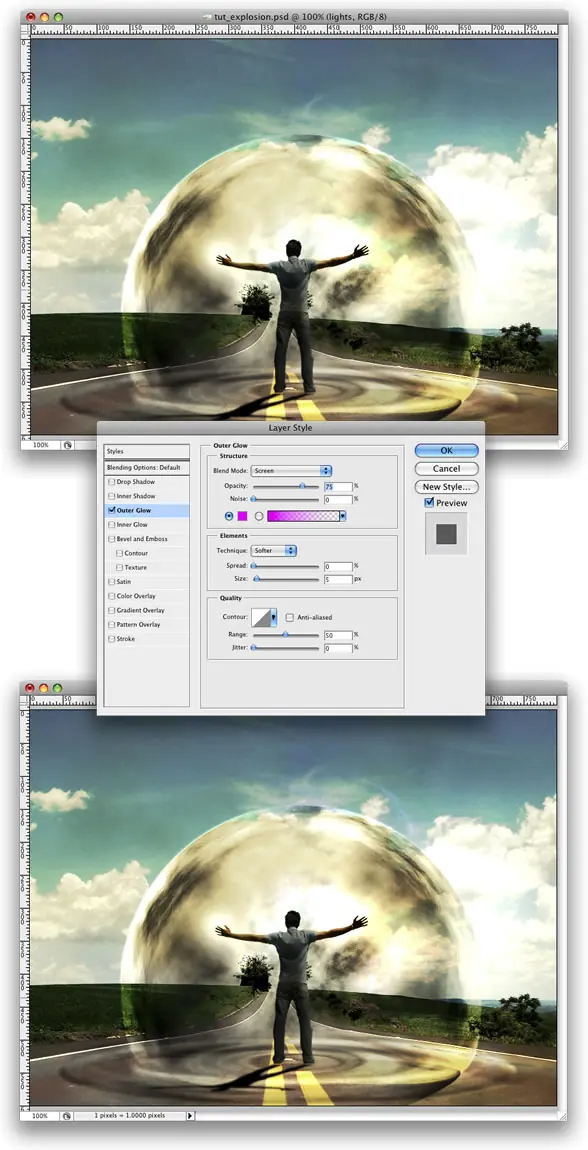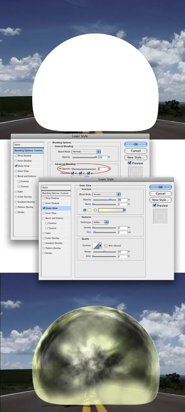 Después de que vaya a Capa> Estilo de capa> Resplandor exterior. Utilice la configuración predeterminada. Luego ir a Capa>> Estilo de capa Crear una capa. Este comando creará otra capa del Resplandor exterior. Usted puede eliminar la capa blanca y dejar sólo la capa exterior del resplandor.