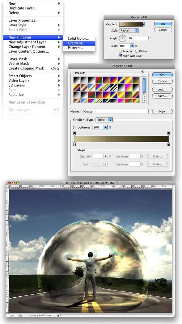 Paso 21Ir a Capa Capa> Nueva relleno> Degradado. Utilice radial para el estilo. Para el uso de colores y # # ddc396 2f1e00. Cambiar el modo de mezcla a Color Dodge.