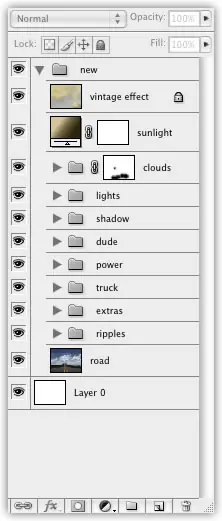 Paso 28El Grupo de los camiones y la capa de sombra y cambiarle el nombre a "camión". Luego organizar sus carpetas en la paleta Capas.