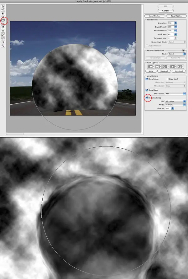 A continuación, seleccione la opción Mostrar telón de fondo. Eso le permitirá ver las nubes y el fondo. Será necesario el uso de la herramienta de hinchar en el lugar correcto. Haga clic en un par de veces y desactive Mostrar el telón de fondo. A continuación podrá ver el efecto y será capaz de repetir más veces en el lugar correcto.