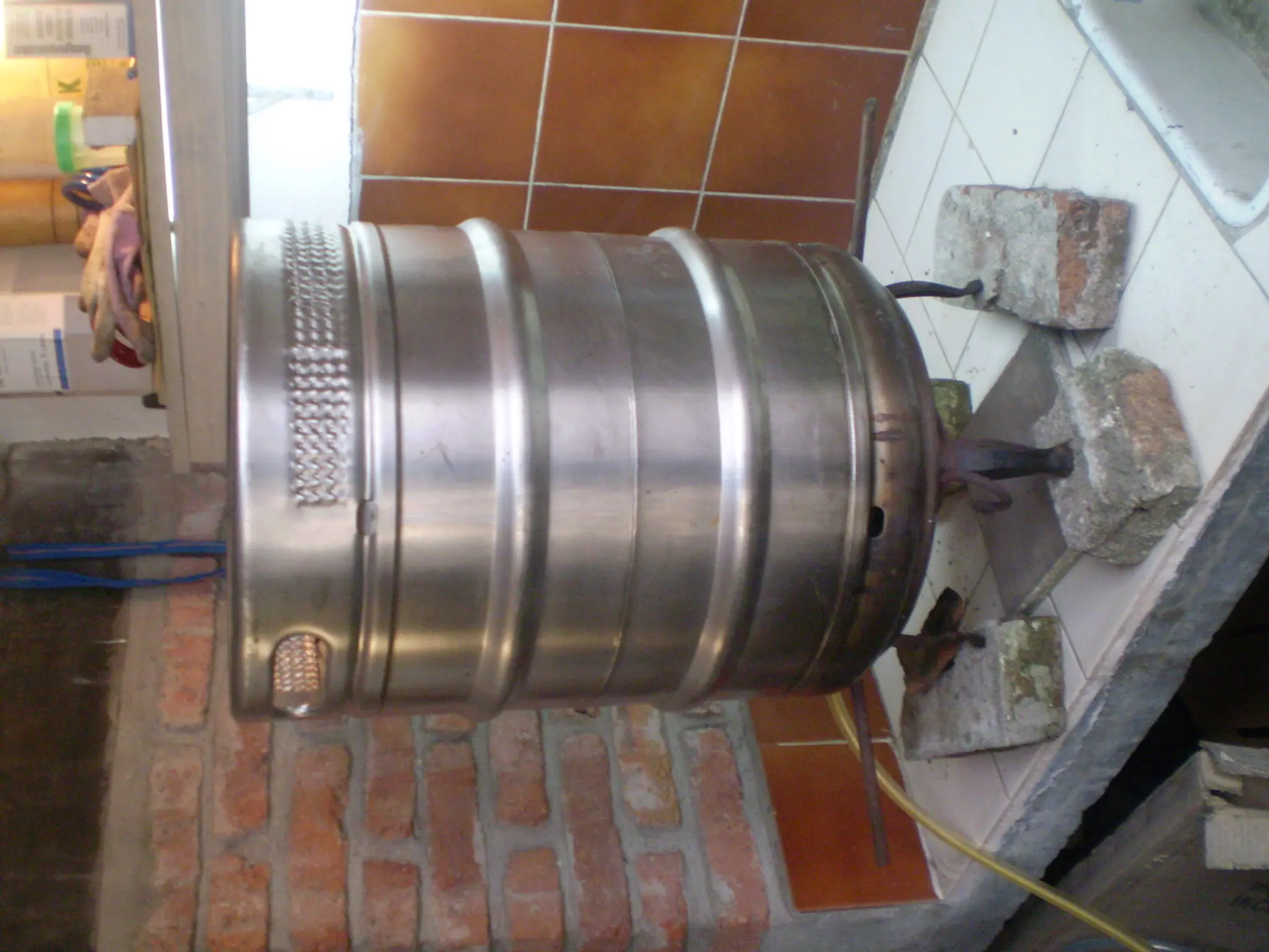 En la parte de arriba, en el tubo de metal, pones una manguerita, que va a estar conectada a la bomba, que va a estar conectada a la olla. Tene cuidado de poner otra manguera en la punta de abajo que vaya al bidon de 20 l, y ya casi tenes tu checha.