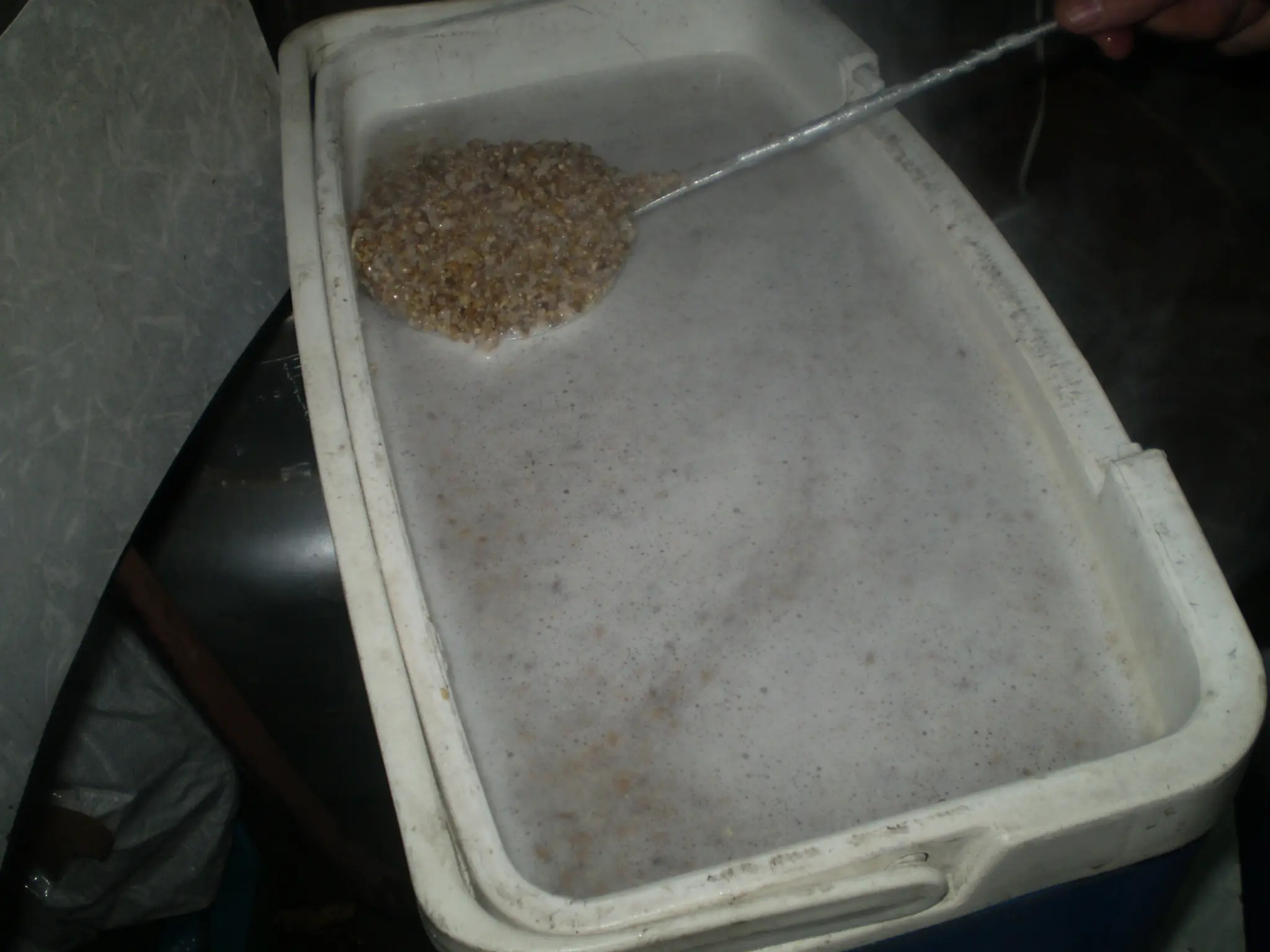 4- Le agregas de a poco y revolviendo los 5 kgs de cevada molida, MOLIDA, la avena y el harina de arroz disuelta en 1 litro de agua hirviendo por cada 1/2 kg, revolves bien y lo dejas reposar una hora (en ese tiempo te podes tomar una quilmes