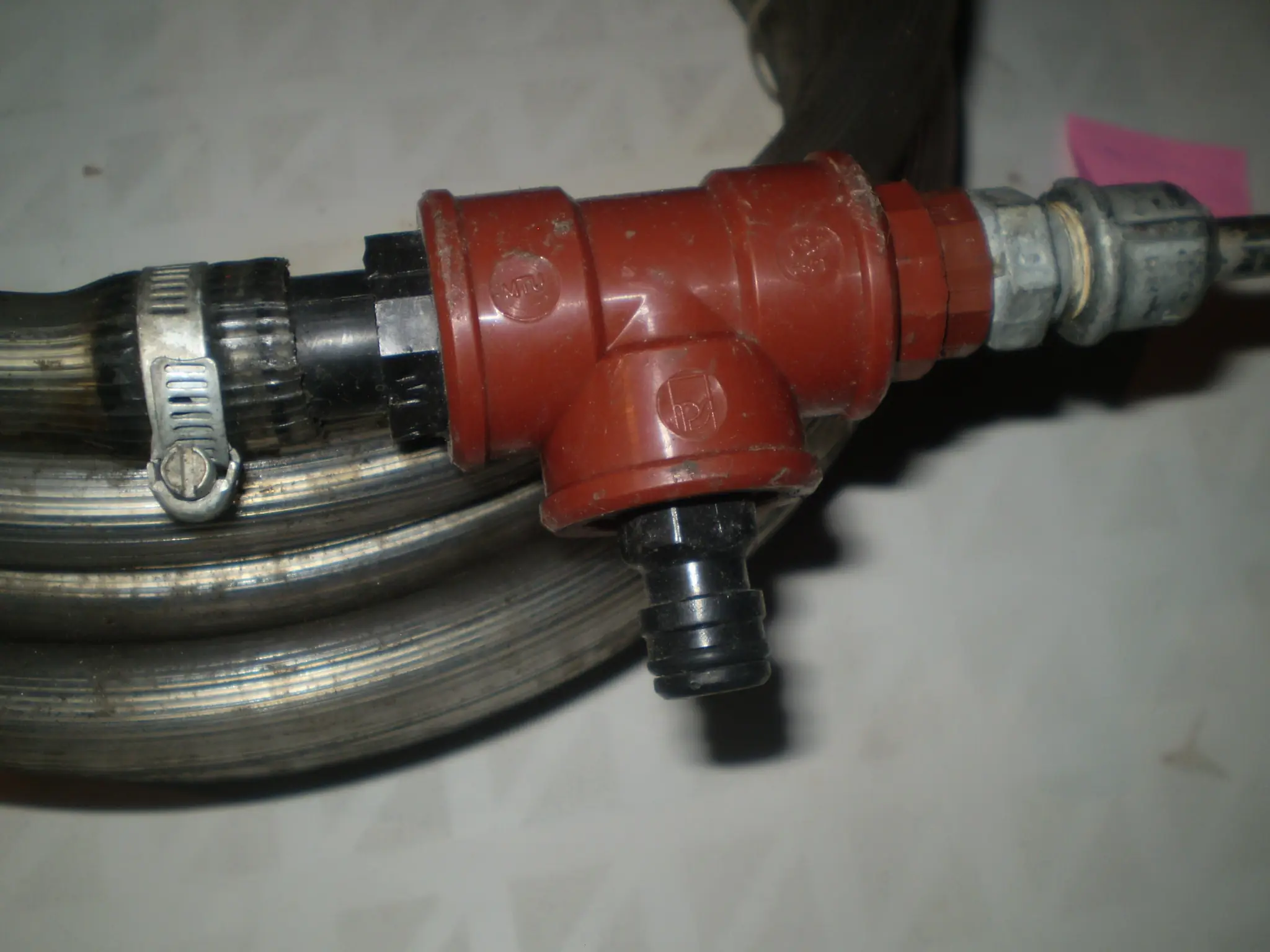 En la parte de abajo, en el pico que lleva al espacio entre el caño de metal y la manguera, enchufas la manguera de agua, para que salga por arriba. IMPORTANTE: QUE ENTRE POR ABAJO Y SALGA POR ARRIBA, POR AFUERA DEL CAÑO DE METAL.