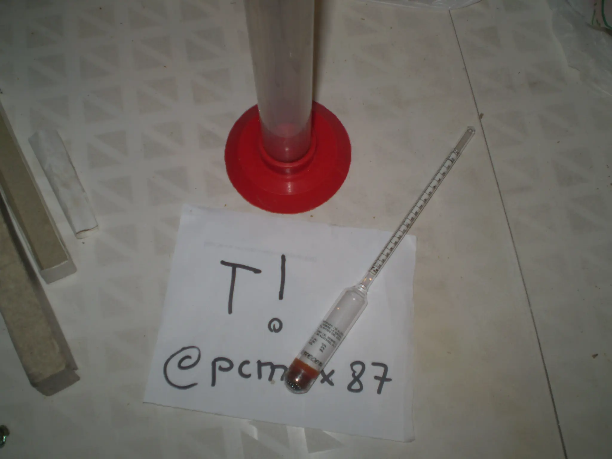 Un densimetro, para medir la graduacion de alcohol y la densidad de la pre-checha