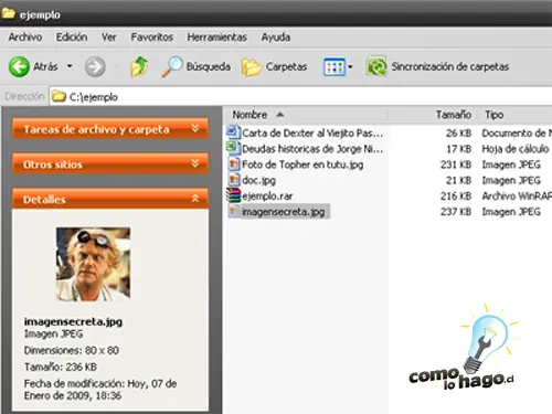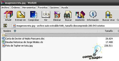 Si nos fijamos en la imagen anterior, podemos ver que en el título de la ventana aparece el nombre del archivo que creamos, imagensecreta.jpg, y nos muestra todos los archivos que contiene, el .DOC, el .XLS y el .JPG, cada uno con su tamaño respectivo.