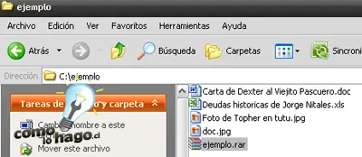 2.- A continuación, lo que haremos será comprimir los archivos que deseamos ocultar, utilizando nuestro software de compresión. En este caso, hemos utilizado WinRAR y al comprimir creamos un archivo llamado “ejemplo.rar”, el cual, como hemos indicado, contiene un archivo de extensión DOC, uno de extensión XLS y uno de extensión JPG.