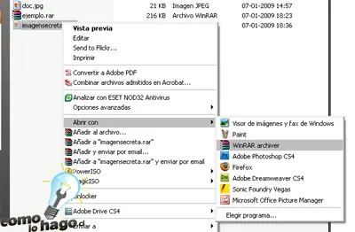 Si nos fijamos, al hacer doble click en la imagen, esta se abrirá con el software predeterminado para ver imágenes (el por defecto de Windows u otro editor que tengan activado), por lo que cada persona que le haga doble click la verá de esa forma. Sin embargo, si ese archivo lo tomamos, y hacemos click con el botón derecho y luego Abrir con y seleccionamos nuestro programa compresor de archivos (WinRAR, WinZIP, 7z, etc), aparecerá lo siguiente: