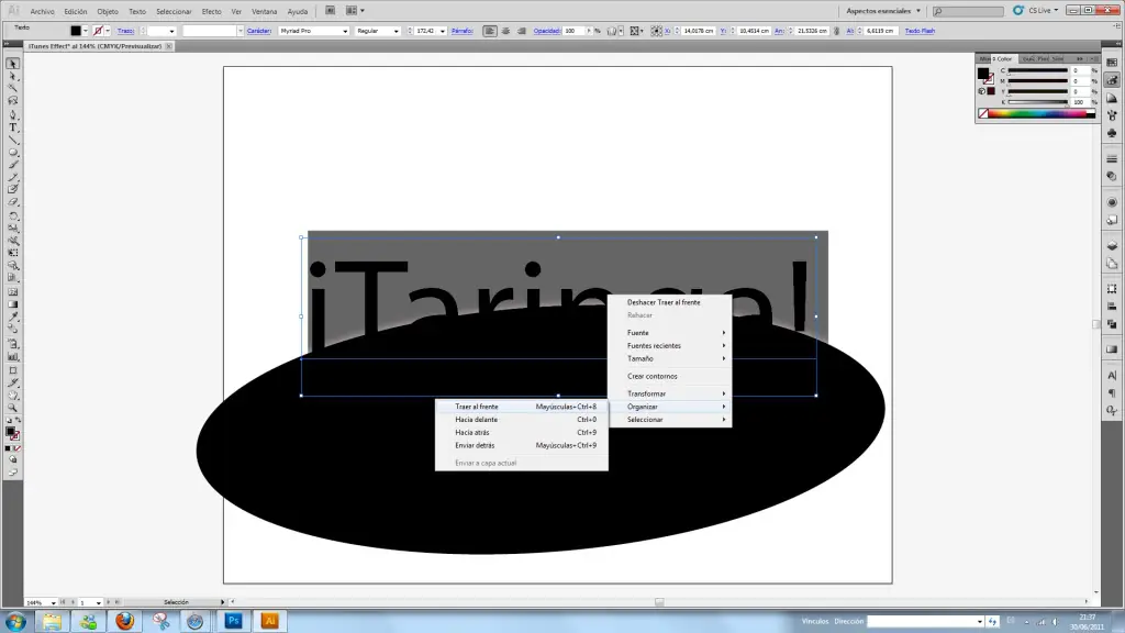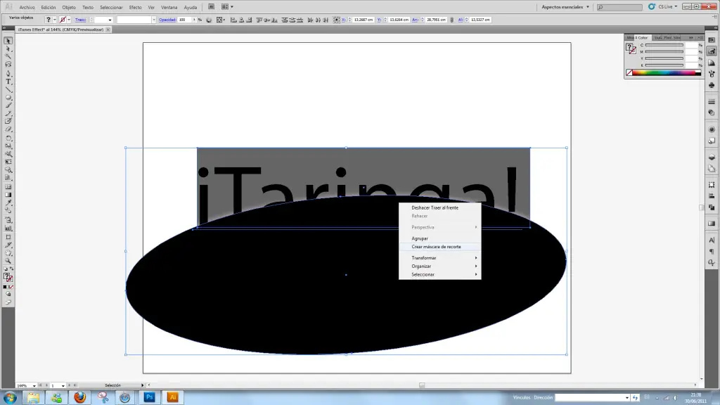 Por ùltimo, con el texto hasta el frente, el Ovoide "enmedio" y hasta Atràs el Rectangulo lo acomodamos de manera que cubra el texto, Seleccionamos todo Ctrl+A---->Clic derecho---->Màscara de Recorte