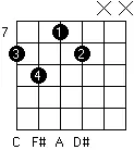 Es un acorde sostenido, o sea que desplazamos el acorde base 1 traste para la derecha... si estamos haciendo un Fa y corremos ese mismo acorde al traste dos, será un Fa#. Es decir, los sostenidos son un semitono más agudos que sus acordes originales. Los sostenidos también se llaman bemoles, y ésto se reemplaza por una b. O sea, Eb es Mi bemol, o Re sostenido. Las igualdades están en el cuadro de arriba, donde te dice cada nota y su equitativo en bemol en el caso de los sostenidos. Aquí tenemos todos los acordes que sabemos, incluyendo los sostenidos: