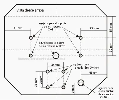 Hagamos los 8 orificios de 4mm de diámetro necesarios para fijar los motores y la rueda móvil. Hagamos también el orificio que servirá para pasar los cables (10 mm de diámetro) y para el interruptor de encendido. El diámetro de este último depende del tipo de interruptor. En mi caso es de 10mm.