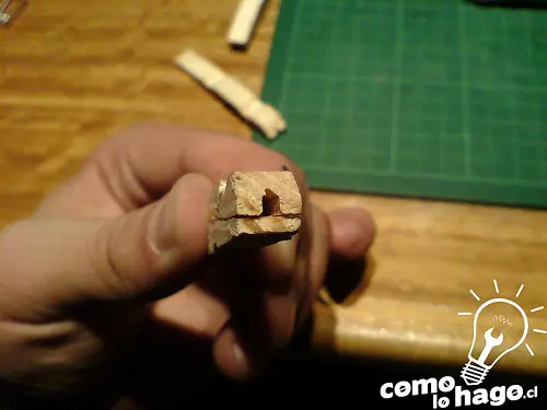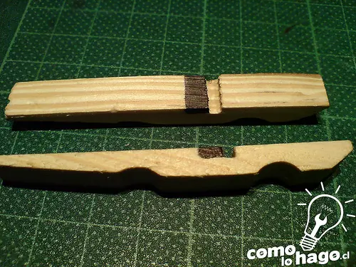 Tomamos las partes de madera y en uno de ellos dos rebajamos la madera en la parte que sale marcada en negro en la fotografía a continuación.