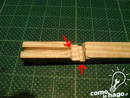 Como pueden observar, posee un calado en una de las orillas, más bien el calado profundo se encuentra en la cara contraria (flecha de abajo) al lado mas corto de el trozo de madera; es importante que este calado exista porque nos servira como soporte para el disparador. Por otro lado el calado más largo (flecha de arriba), debe tener de profundidad, la profundidad de el calado que le sigue, además de que su grosor debe ser el suficiente para que quepa un fosforo.