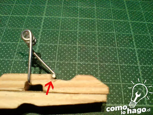 Debemos acomodar el resorte. En la parte de arriba es recomendable rebajar un poco la madera para que el resorte se apoye sobre esa zona y si sacamos el dedo, el resorte quede quieto y no se mueva ni resbale. En la parte de adentro también debe quedar acomodado en la ranura que dejamos a propósito.