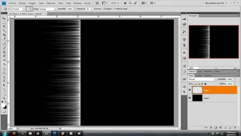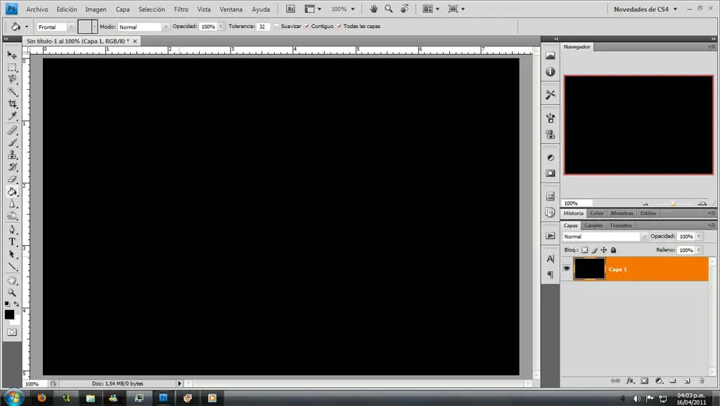 Lo Primero es crear un documento nuevo a gusto, en mi caso abrí uno de 800 x 600. Darle en Aceptar y rellenarlo con color negro.