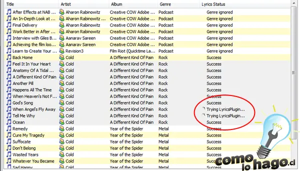 Con ello comenzará automáticamente la búsqueda de letras y su posterior actualización de cada ID3 tag de cada arcivo MP3 de manera que el proceso se realiza automáticamente. Como se observa en la imagen, las canciones listas toman el status en la columna “Lyric status” de Succes, mientras que las que están siendo actualizadas dicen “Trying LyricsPlugin…”.