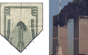 Al doblar el billete de 5 dólares muestra las torres antes del ataque y el de 10 muestra las torres tras el primer golpe.