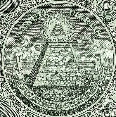 Dando vuelta el billete, la primera imagen que impresiona es la piramide con un ojo en su parte superior.La llamada “Pirámide con el Ojo que todo lo ve”, símbolo de la masonería que hace referencia al Ojo de Horus, un antiguo Dios egipcio que representa al Sol.