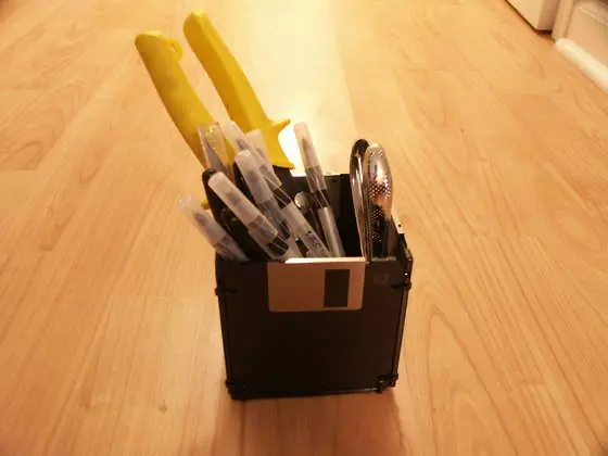 una opción es crear este amplio lapicero hecho solamente con cinco diskettes y cinta para entrelazarlos. Una opción rápida y sencilla que puede ser de gran utilidad.