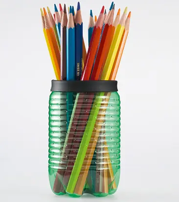 Lapicero: Es posible obtener un portalápices con una botella de tamaño mediano o pequeño. Sólo hace falta recortarla por la mitad e incluir cuidadosamente la cinta en el borde