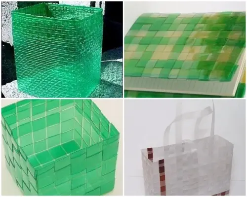 Cajas: Para los que se animan a más es posible lograr novedosas y útiles cajas. Cortando cuidadosamente la botella en tiras iguales, se debe entrelazarlas de manera perpendicular para así lograr el entramado perteneciente a cada lado. Con esta técnica también se pueden lograr otros objetos como carteras,bolsas y envoltorios para cuadernos.