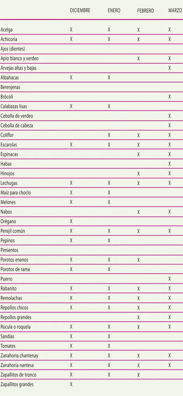 Aromáticas en general, acelgas, achicorias, ajos, apios, berenjenas, cebollas, coliflores, espinacas, hinojos, lechugas, pepinos, melones, zuchinis, pimientos, puerros, rabanitos, repollos, rúculas, tomates, zanahorias.