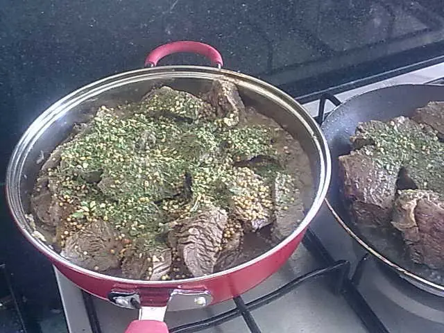 Le agregamos semillas de mostaza (NO SON CARAS!) y reservados dos cucharadas de semillas para decorar el plato. La otra carne la dejamos en la heladera y le agregamos ABUNDANTE PIMIENTA (la que va a la pimeinta)