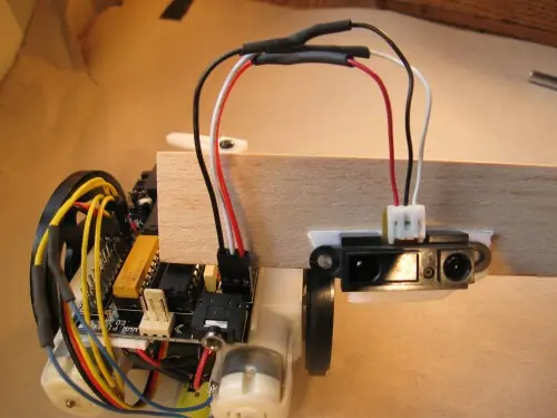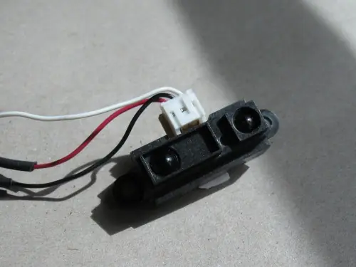 El "ojo" envía la luz infrarroja. El otro ve el reflejo de esto (si lo hay), y la unidad vuelve a la distancia al objeto en frente de ella. Cuenta con 3 cables (asegúrate de que tienes el cable para ello, o puede ser un poco difícil de conectar). Se le da el poder el 2 de los cables, y el tercero se conecta al microcontrolador, y dice que la distancia.