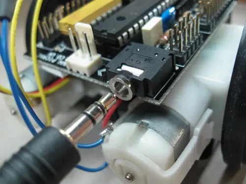 Cuando usted tiene las ruedas de los motores, cortar uno de los cables de mujer a mujer por la mitad, quitar algunos de los de plástico del extremo del alambre, y la soldadura en funcionamiento. Y hacer lo mismo con el otro motor.