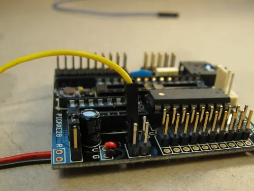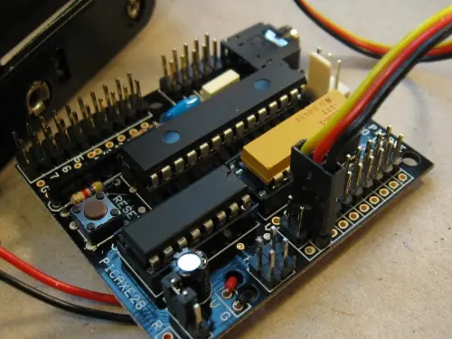 Muchas veces los consejos que comprar sólo tienen agujeros en ellos, y que hace que sea difícil para tapar algo en / sobre. Una forma de superar esto, es para soldar los cables en los agujeros. Otra es añadir estos pines, para que pueda conectar en los cables, al igual que con el servo y los encabezados de las mujeres se muestra a continuación. "¿Por qué no acaba de poner alfileres en todos los agujeros de la fábrica", usted puede pedir. Bueno, yo no lo sé. Tal vez nos dan la opción. También es posible soldar encabezados femenina en el tablero, tal vez por eso.