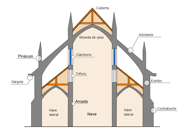 Los cambios constructivos más importantes se manifiestan en la bóveda de crucería y el arbotante. La bóveda de crucería, derivada de la de arista, consigue localizar sus empujes sobre cuatro puntos de arranque lo que permite cubrir todo tipo de espacios. El arbotante por su parte es una especie de puente que transmite las presiones desde el arranque de las bóvedas altas hasta los ligeros contrafuertes del exterior, permitiendo así abrir mayores vanos en la fábrica del edificio.
