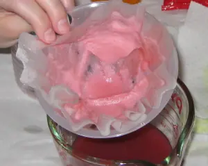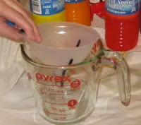 Hay varias maneras de cepa estas cosas y consigue que todas las blancas Gunk a cabo. Algunas personas prefieren las toallas de papel, pero he usado filtros de café y comprobó que trabajaron tan bien. Puse un embudo dentro de una taza de medir.