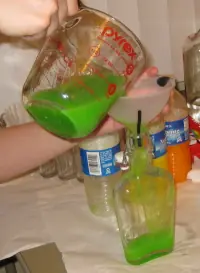Entonces tomé el líquido de la taza de medir y se vierte en un frasco, ahora a través de la limpieza embudo. Usted puede ver que el verde es un poco espeso, y que no debería haber sido - es por eso que llegó a tener que volver a filtrarla. Luego enjuagar el embudo de nuevo.