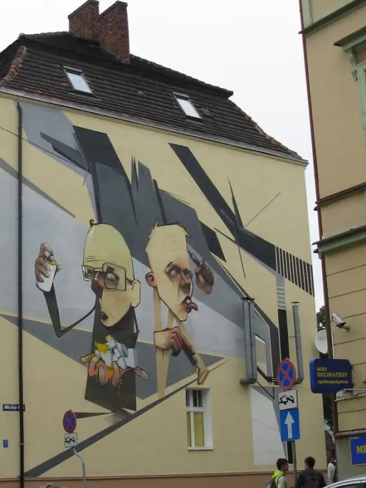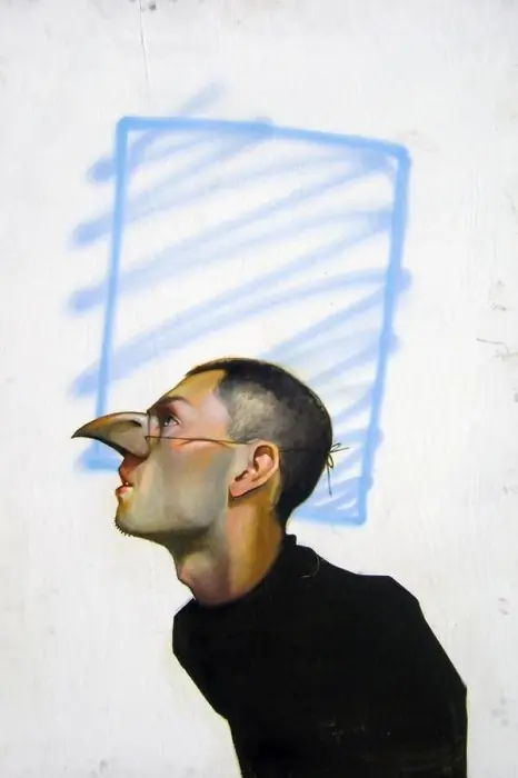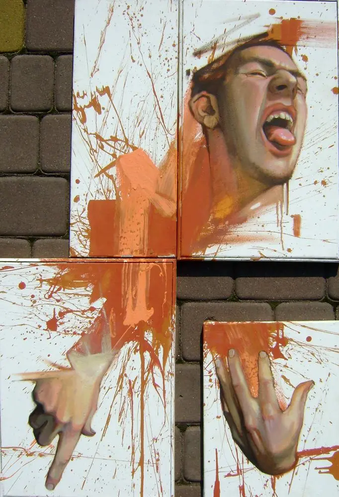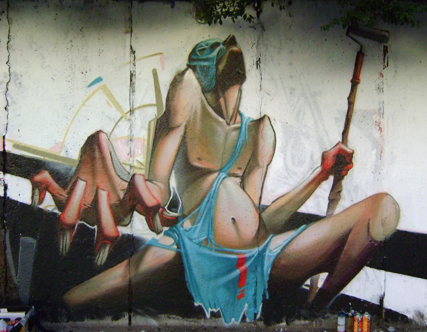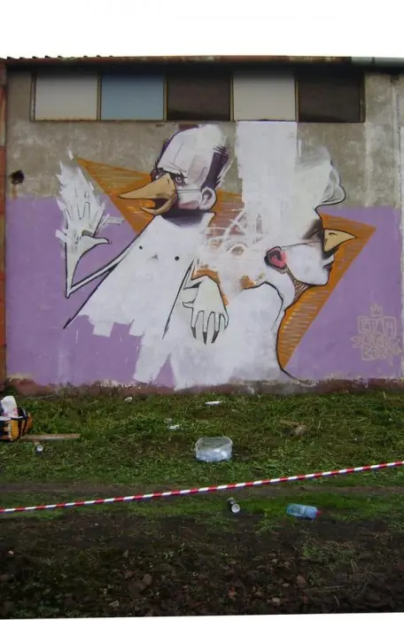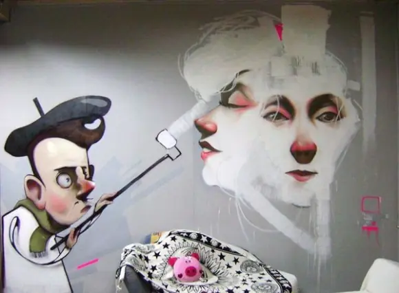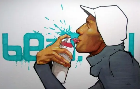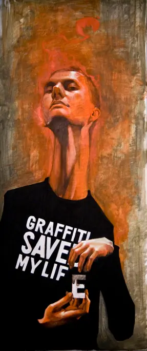 Es un lienzo con tematica urbana, no es un graffiti, lo que quiero decir es que el graffiti su intencion real es escribir tu nombre y que los demas escritores lo vean, hay artistas muy buenos que hacen piezas como estas en la calle, pero no se les considera graffiti, se les considera mas arte urbana o intervencion urbana, pero por ignorantes como ustedes cualquier cosa que este en la calle es graffiti...