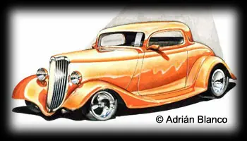 La técnica mixta aplicada al boceto de esta coupe Ford 1934, permite llamar la atención del observador con colores intensos, reflejos destellantes e ilusiones visuales.