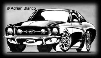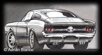 Este dibujo, de un clásico Ford Mustang Fastback del año 1967, es un ejemplo de cuánto puede resaltar la figura del fondo tan solo utilizando algunas zonas blancas de luz y sombras bien marcadas que definen formas.