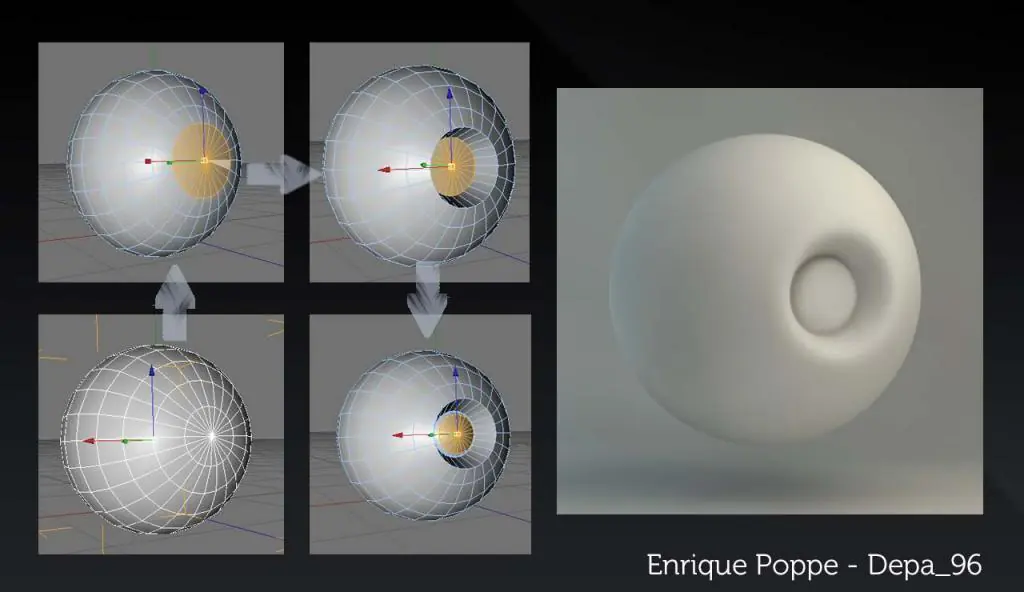 Primero cree una Esfera. Seleccionando los poligonos centrales, los agrande un poco. Luego los extrui hacia adentro. Finalmente los