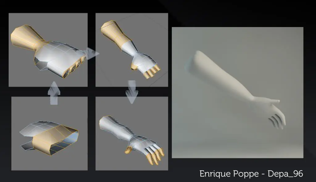 de abajo con un puente, todo esto para poder sacar la muñeca. Posteriormente, extrui el brazo y empece a sacar los dedos en base a