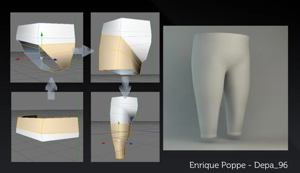 poder hacer un puente. Luego los extrui hacia abajo una vez. Posteriormente, cree la parte de la entrepierna, seleccionando un
