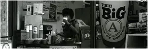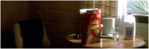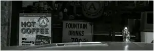 Un círculo en el mostrador, algunos frascos en la ventana y un cartel, que anuncia esta falsa marca de café de Oak Ridge.
