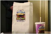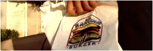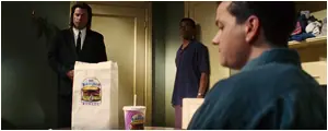 Cuando Brett y sus amigos son soprendidos por Vincent y Jules están desayunando con las hamburguesas Big Kahuna Burger.