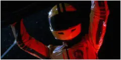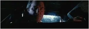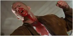 Stuntman Mike pone su rostro ensangrentado por Pam después de la violenta colisión de cara de la chica contra el salpicadero.