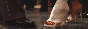 Durante la entrada de O-Ren y su banda en el House of Blue Leaves, la cámara se detiene en un primer plano de las tradicionales sandalias japonesas calzadas por la mujer.