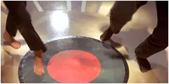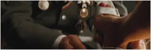 Primer plano de los pies, mientras que el coronel Landa, le coloca el zapato que sospecha, es de su pertenencia.