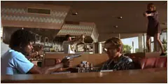 Mira Sorvino, homenajea a Tarantino, en una escena de dos amigos en su casa, podemos ver de fondo una bolsa de Big Kahuna Burger.