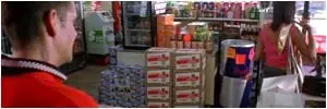 Varias botellas de cerveza también son visibles dentro de la tienda.