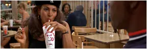 Angela bebe de un vaso que lleva el logotipo de la hamburguesa Big Kahuna.