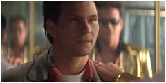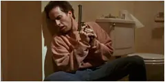 Uno de los amigos de Brett se esconde en el baño listo para disparar.