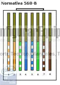 Podemos ver un esquema de terminación de un cable de red siguiendo la norma “568-A” en esta imagen: