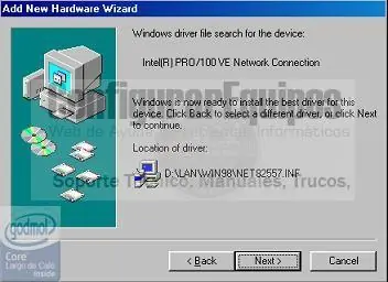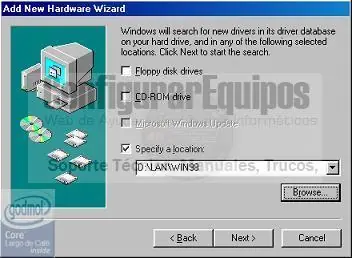 En esta pantalla colocamos la ubicación de los drivers de la tarjeta de red, marcando la check box “Especificar ubicación” (Specify a location) y seleccionamos la unidad y carpeta pulsando en el botón “Examinar” (Browse) y pulsamos en el botón “Siguiente” (Next) que nos presenta otra pantalla.
