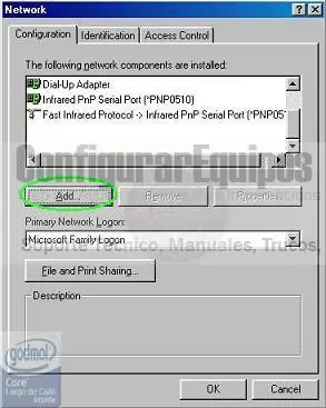 Es necesario comprobar que están en la ventana los adaptadores de red, los servicios normales y el protocolo TCP/IP. Al haber realizado la instalación del sistema operativo y de la tarjeta, están todos los elementos salvo uno muy importante, el servicio “Compartir archivos e Impresoras de Microsoft Windows” imprescindible para que podamos compartir recursos en nuestra red local y lo vamos a añadir. Pinchamos en el botón “Añadir” (Add) y vemos que se nos presenta una ventana nueva